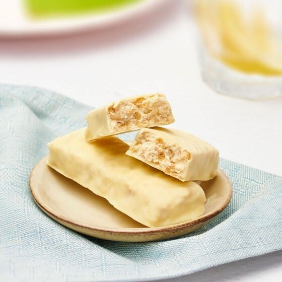 Ook zo gek op witte chocolade? Probeer dan eens onze fruitige crispy appel reep, omhuld met een laagje witte chocolade. Deze glutenvrije reep heeft een frisse appel smaak en een lekkere bite!